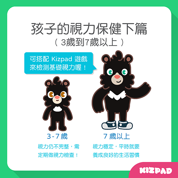 這個時期,父母要特別注意孩子的視力問題,除了要培養孩子正常生活習慣之外,也要定期去做視力檢查。Kizpad內建的檢測功能,可以提供基礎的視力檢查,讓孩子透過遊戲,也可以順便做視力檢測喔!