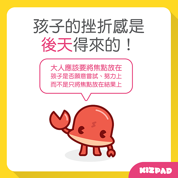 當孩子遇到失敗時,大人應該要將焦點放在孩子是否願意嘗試、努力上面,而不是一直將焦點放在結果上。讓孩子明白只要盡力就會有進步,孩子不會因為失敗而感覺到被比較,更不會因為失敗而感覺到大家不喜歡他們。