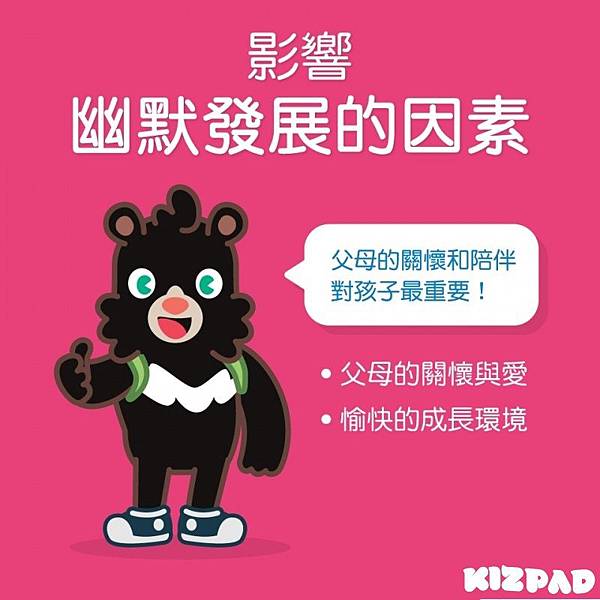 - 父母的關懷與愛: 研究發現,三歲之前獲得父母較多關愛的孩子,會較有樂觀的心態,而樂觀的心態就能培養出幽默感;因此建議家長多與孩子互動,並多花時間陪伴孩子喔。
