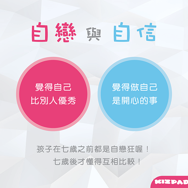 七歲之前的孩子,天生下來都是自戀狂。舉例來說,如果你問幼兒園的小朋友:「你們班上誰最乖啊?」每個小朋友都會自以為是的認為是他自己。然而等到七歲之後,這些孩子的眼睛會從頭頂降回一般的高度,開始懂得互相比較,並且分析自己的優點與缺點。所以孩子在成長的過程,也會慢慢的形塑自己的自戀與自信的性格。