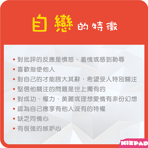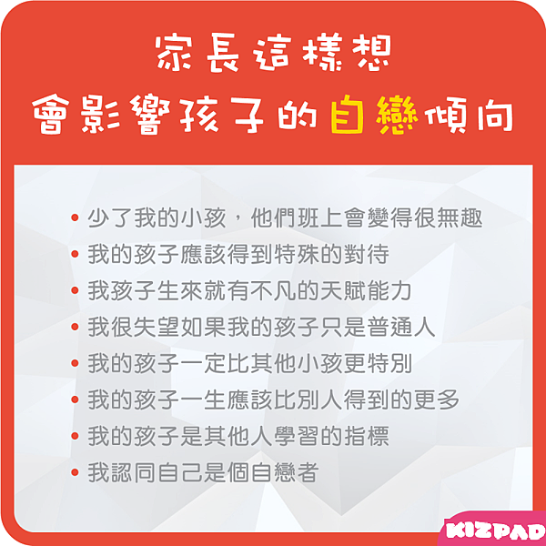 自戀的小孩永遠認為自己比別人優秀,心中持續幻想著一些不存在的成功事蹟,認為自己應該得到更多注意、更多讚美。自戀小孩一旦被羞辱,他們不僅不能接受,而且會非常生氣,甚至訴諸暴力反擊。