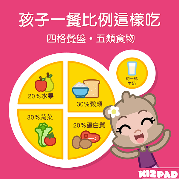 根據 MyPlate,給孩子的一餐可以在這樣一個四格餐盤的結構下完成。其中包含: 30%的蔬菜、30%的穀物、20%的水果、20%的蛋白質,還有等同於一杯牛奶分量的奶製品 ,可以是牛奶,也可以是酸奶、奶酪。