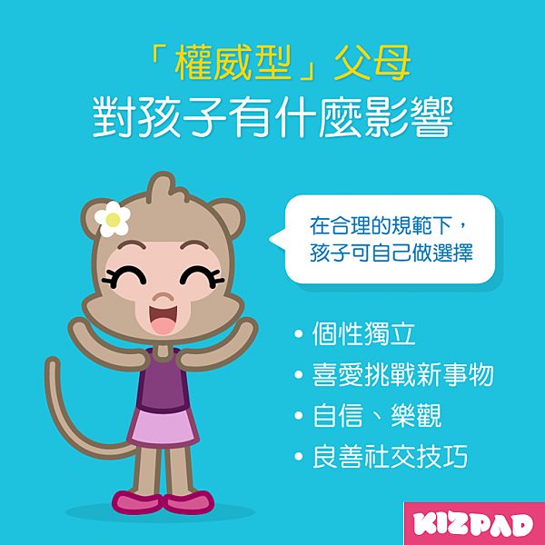 權威型的父母在合理的規範下,允許孩子自己做選擇,並讓孩子自我成長,因此這類的孩子個性較獨立,也喜歡挑戰新事物,對環境適應力佳。在這樣的教導之下,孩子會慢慢養成自信、獨立、合作、積極樂觀、善社交等良好的性格品質。