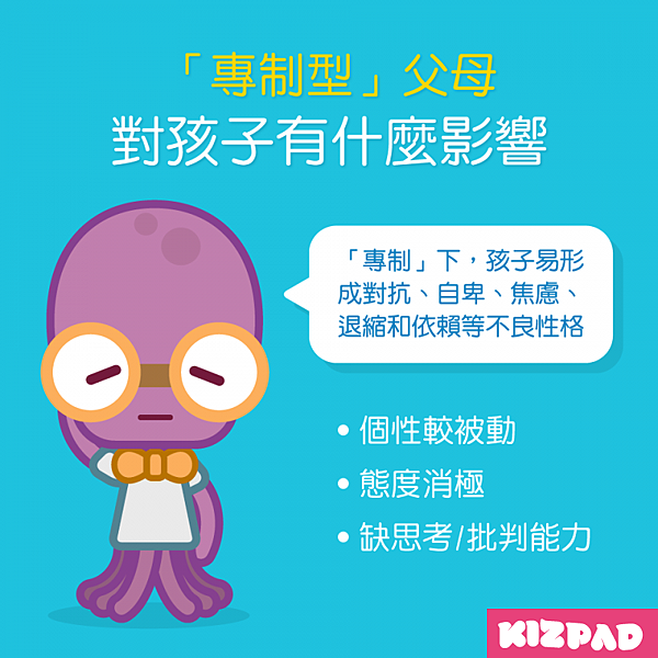 在這種"專制"下,孩子容易形成對抗、自卑、焦慮、退縮、依賴等不良的性格特徵。在孩子的成長過程中,父母總是扮演命令者的角色,若是不聽令可能就會惹來麻煩。因此,孩子往往是一個口令一個動作,性格上較為被動,態度也偏向消極退縮,因為他認為有人會命令他,也唯有照著這個命令做事,才會被肯定,更因為如此,孩子較不動腦、選擇,長大後,也較缺乏思考、批判的能力。