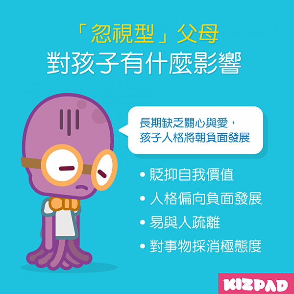 由於長期受到父母的忽視,即使表達出情感,也只能得到父母敷衍式的關心,長久下來,孩子的情緒可能發展不良;認為自己不受到重視、貶抑自我價值,人格偏向負面發展。且自小無法與最親密的照顧者建立良好的依附關係,易與人疏離,而影響日後人際互動的發展。這類孩子自控能力差,對一切都採取消極的態度。