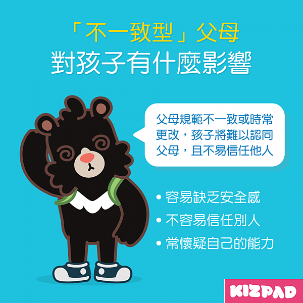 由於父母的規範不同且時常改變,子女也難以認同父母,並且無所適從,在適應上易出現困難;因此容易缺乏安全感,不易信任別人,更可能回過頭來懷疑自己是否做得不夠好。