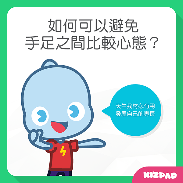 這時候父母要讓孩子知道每個人都有自己的優缺點,以及要讓孩子知道努力是可以不斷的進步,只要他們不斷的努力,總有一天就會成功了!